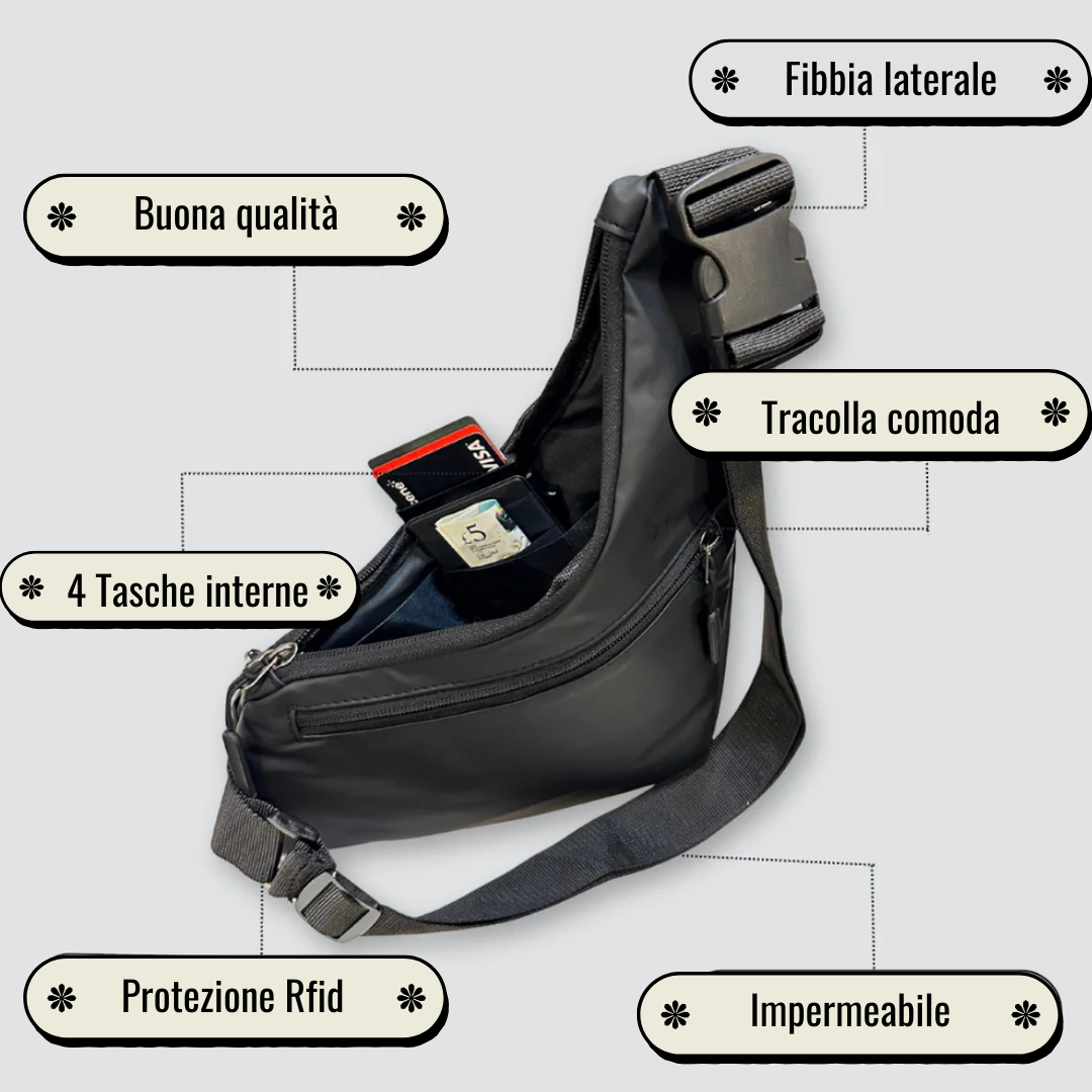 Realizzata con materiali di alta qualità, è impermeabile e protegge i tuoi oggetti personali da pioggia e umidità. La fibbia laterale resistente e la tracolla comoda e regolabile garantisce una vestibilità stabile e confortevole per tutto il giorno. Ben organizzata, all'interno trovi 4 tasche perfette per custodire portafoglio, oggetti personali e documenti sempre in ordine.